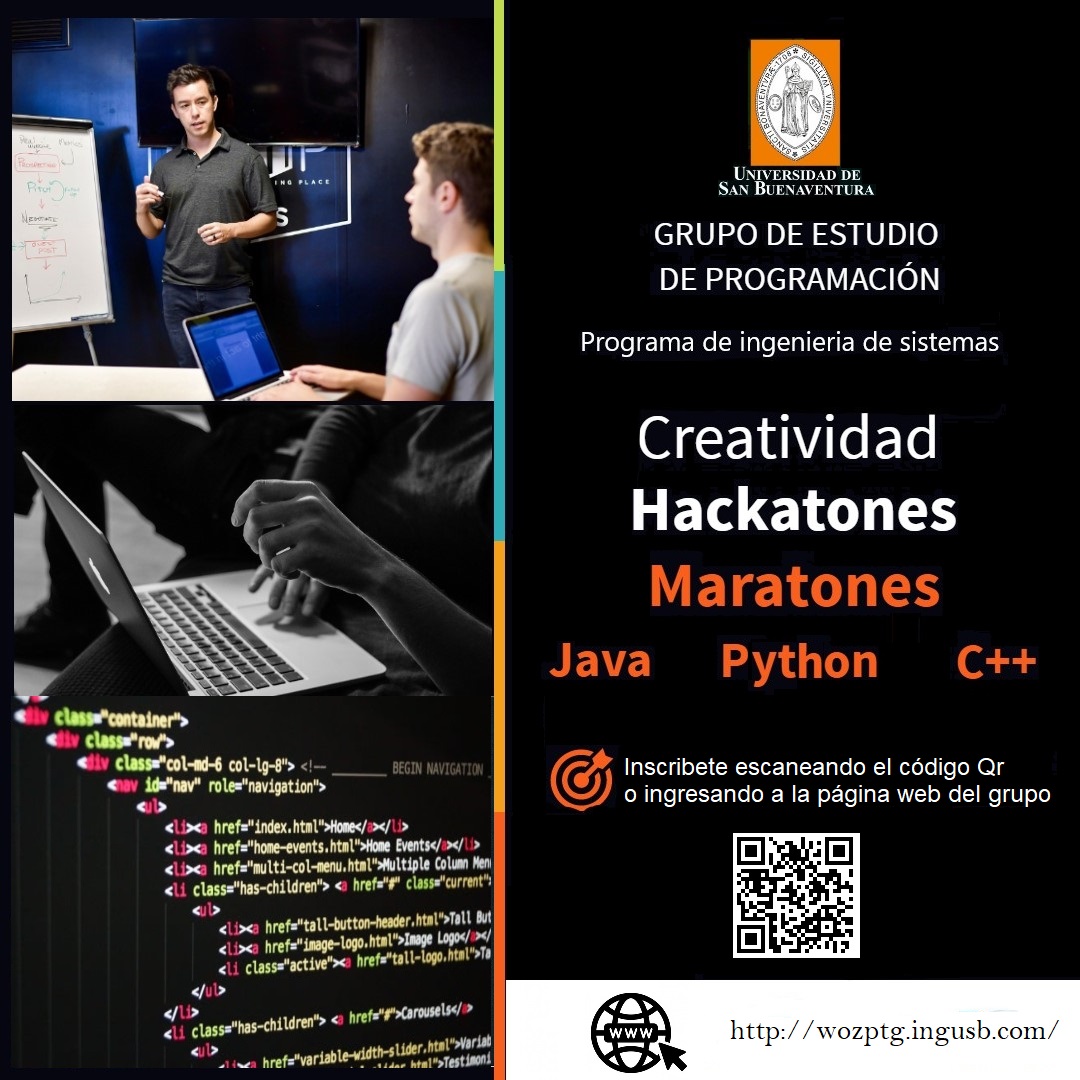 Woz-PTG whose acronym means Wozniak - Programming Training Group. We are a group of study of programming of the system engineering program of the University of San Buenaventura Bogotá, focused on the preparation for programming marathons organized by REDIS or ACIS, national or international hackathons and development of algorithmic creativity.
